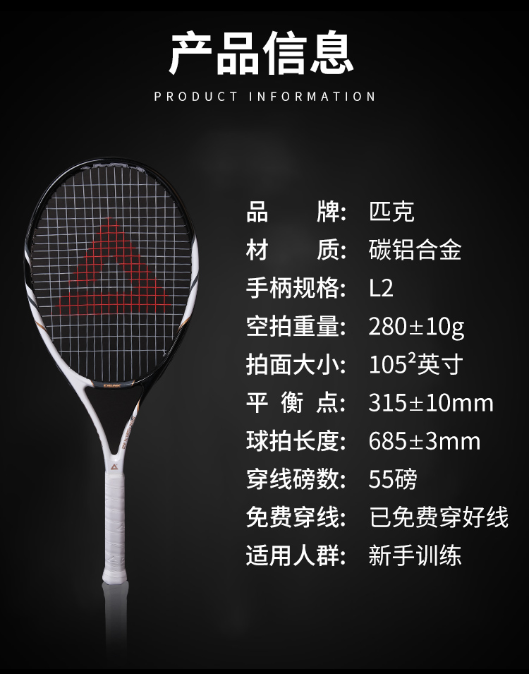 匹克网球拍男女初学者专业碳素复合单只网球带绳回弹训练器套装黑