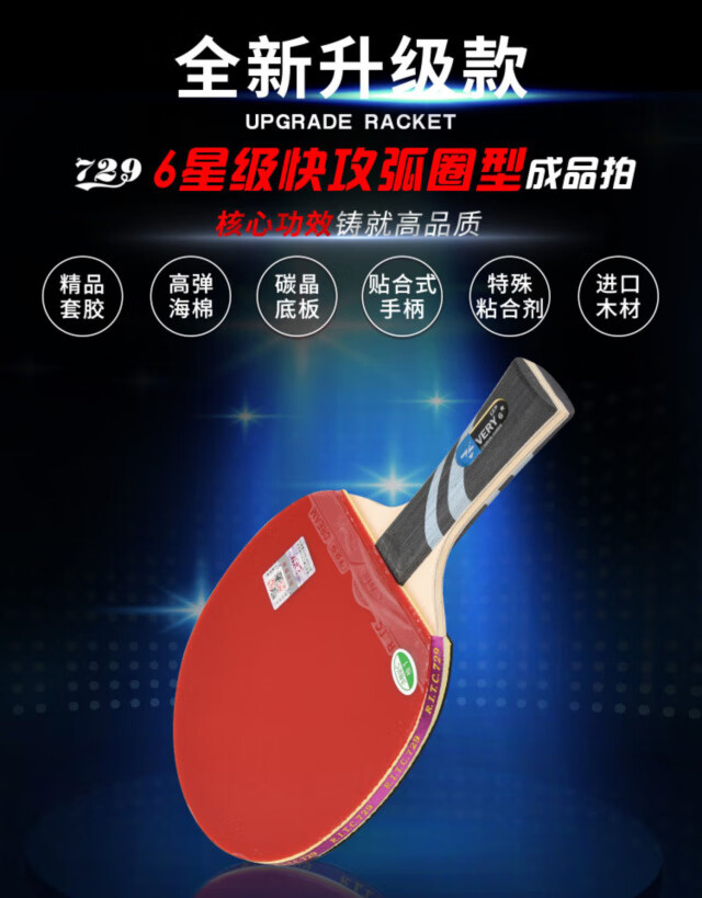 729乒乓球拍横拍单拍6星六星VERY碳素球拍长柄双面反胶